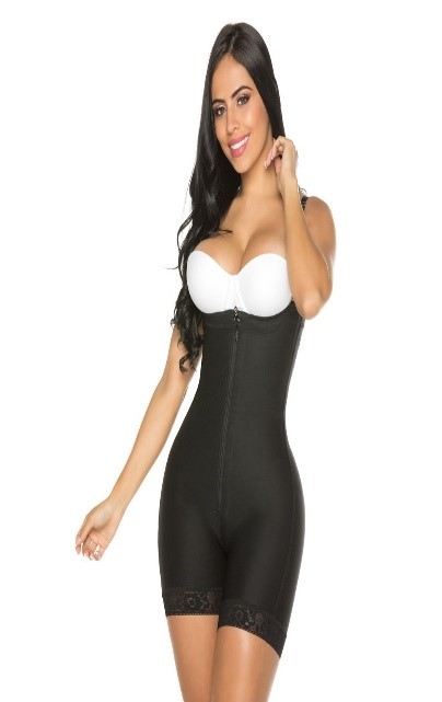 Faja short senos libres, strapless, broches internos y cierre frontal. Tiras ajustables y removibles. Diseño especial en los glúteos para mayor realce, terminación en encaje siliconado, abertura en el área perineal.